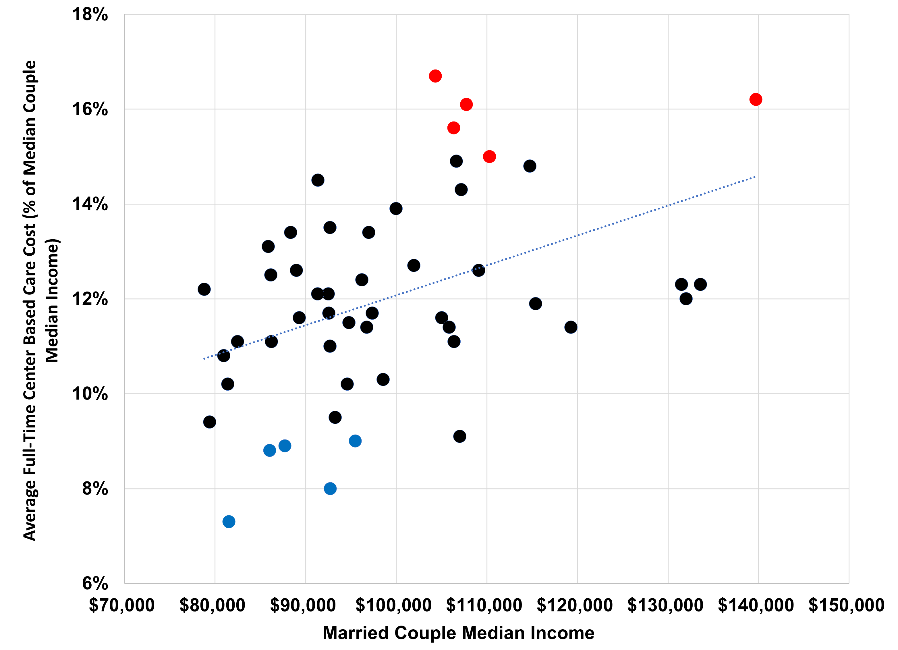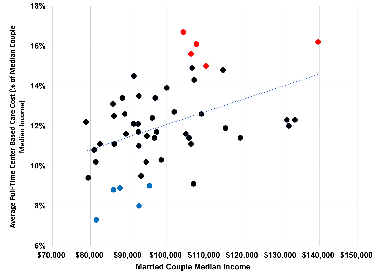 One prediction of this effect is that childcare will be disproportionately more expensive in high income areas. Listing states by median income levels doesn’t perfectly correlate with a state’s unaffordability (r = 0.4), but, as you can see, there is a modest correlation between the two (the five least affordable states are in red; the five most affordable in blue).
