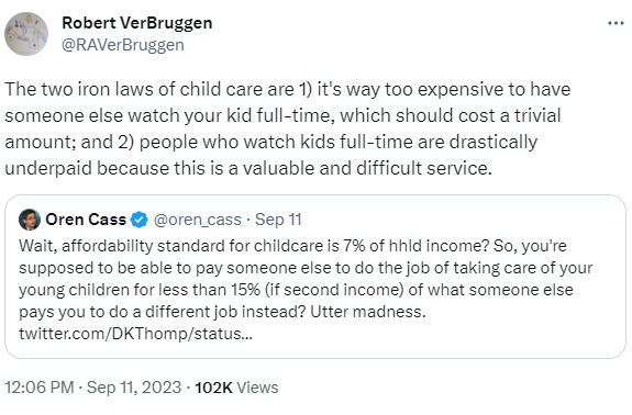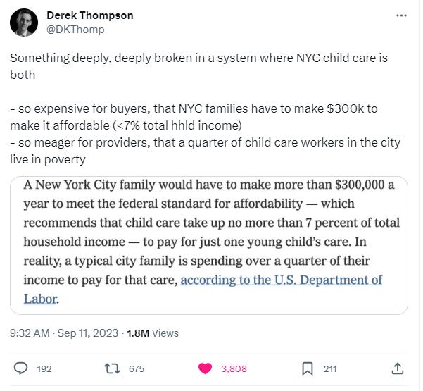 The tweet below from The Atlantic’s Derek Thompson kicked off an interesting debate on X/Twitter: why is childcare so expensive?