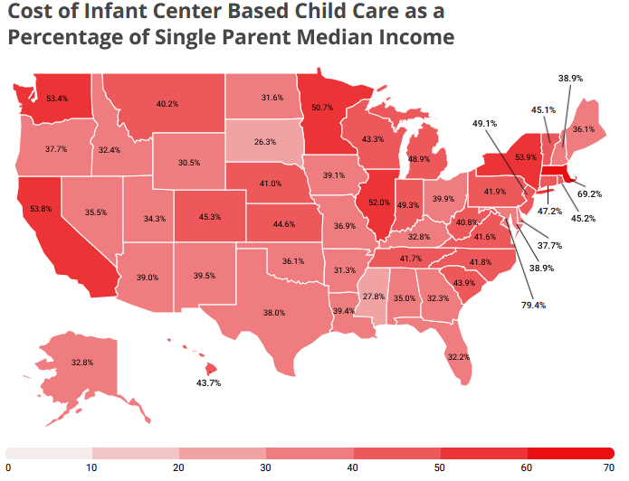 Since single parents have lower incomes, these prices as a percentage of state-level median single parent income are, perhaps unsurprisingly, much higher still. We’re talking well over 25 percent in all states, above 50 percent in five states, and 79.4 percent here in Washington DC. Those are obviously prohibitive for many single parents to afford formal center-based care.