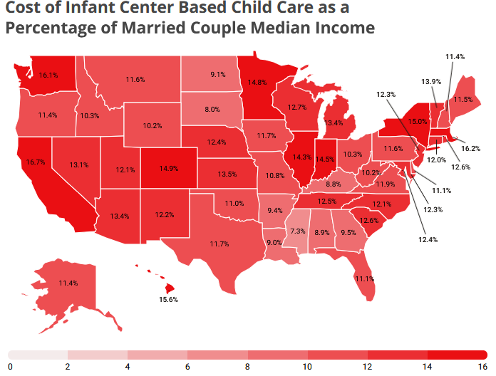 First, let’s establish whether the premise is correct. Looking across states, childcare costs actually vary dramatically. The average cost of full-time infant center care in 2020 ranged from a low of $5,933 in Mississippi to a high of $24,378 here in Washington DC (data from Childcare Aware of America); for family home-based care the equivalent figures ranged from $4,309 to $18,425 for those same places.